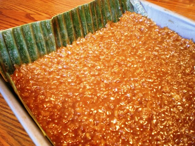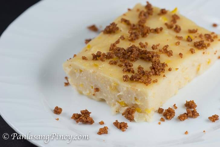 Cassava cake- Cassava cake is a traditional Filipino moist cake made from grated cassava, coconut milk, and condensed milk with a custard layer on top. It is a very popular dish in the Philippines, where It is commonly eaten for merienda. It is also served during gatherings and special occasions.